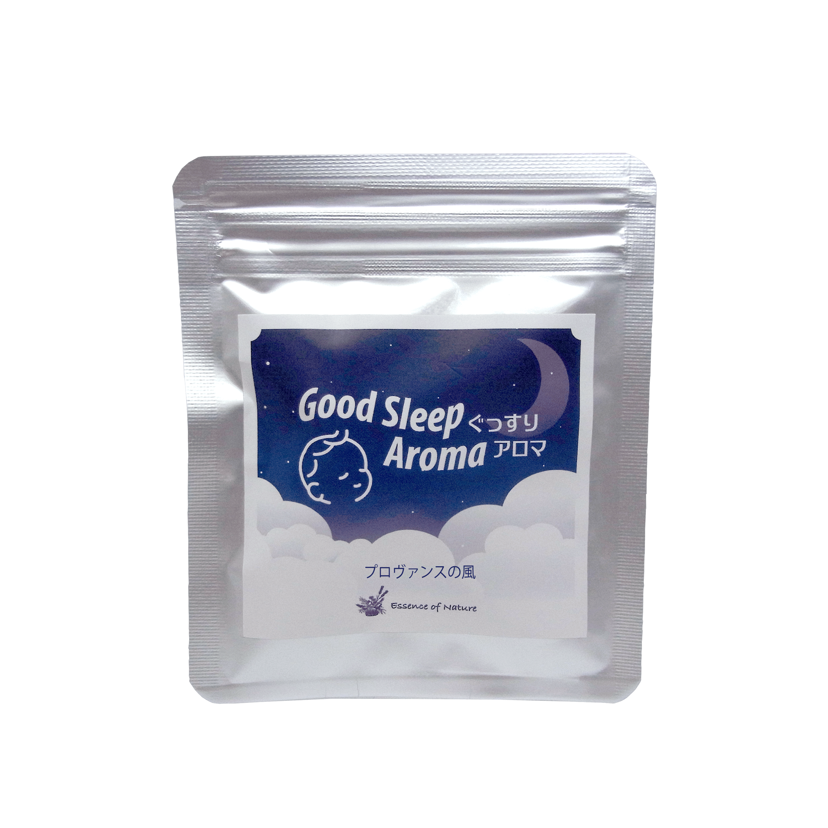 「ぐっすりアロマ」は質の良い眠りに必要なこのセロトニンを誘発させ、心地よい眠りに誘う新しいアロマです。枕元に置いて手軽に使えるサシェタイプの寝室用芳香剤で、枕の消臭効果もあります。