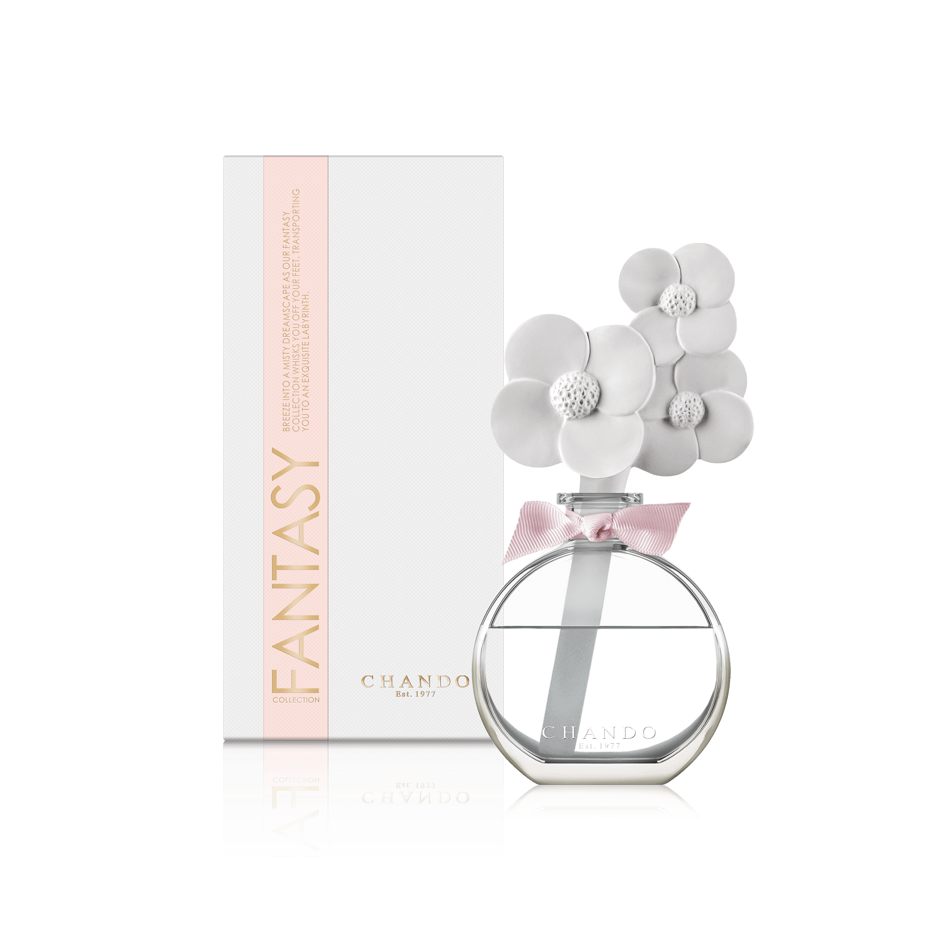 蓮の根をイメージしたラインが刻まれた無地のボトルが、カラーの上品な花を惹きたてて、清楚な佇まいとなっています。